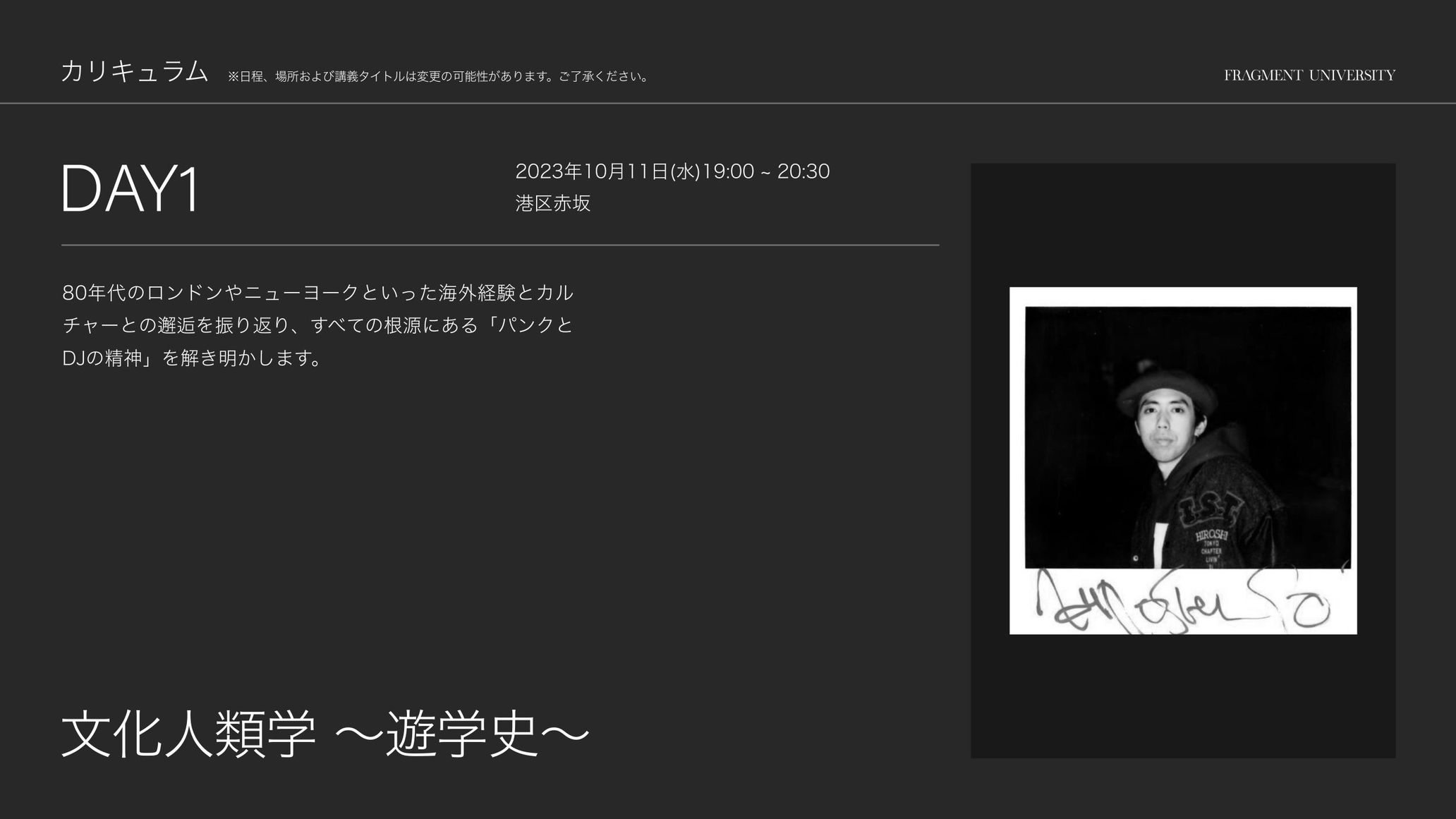 開校に際して藤原ヒロシは、「僕が『教えること』は何もないと思うんですが、皆さんが「学べること」はあるのかもしれません。見てきた景色、経験したこと、ざっくばらんにお話しします。過去から今へと繋がる様々な出来事を、フラグメント大学のスタッフと共に解き明かしたいと考えています」とメッセージを寄せる。