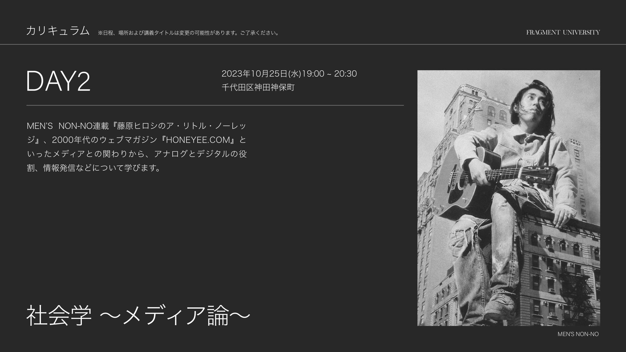 「MENʼS NON-NO」連載『藤原ヒロシのア・リトル・ノーレッジ』(1995〜2006 年)、2000年代のウェブマガジン『HONEYEE.COM』といったメディアとの関わりから、アナログとデジタルの役割、情報発信などについて学ぶ。