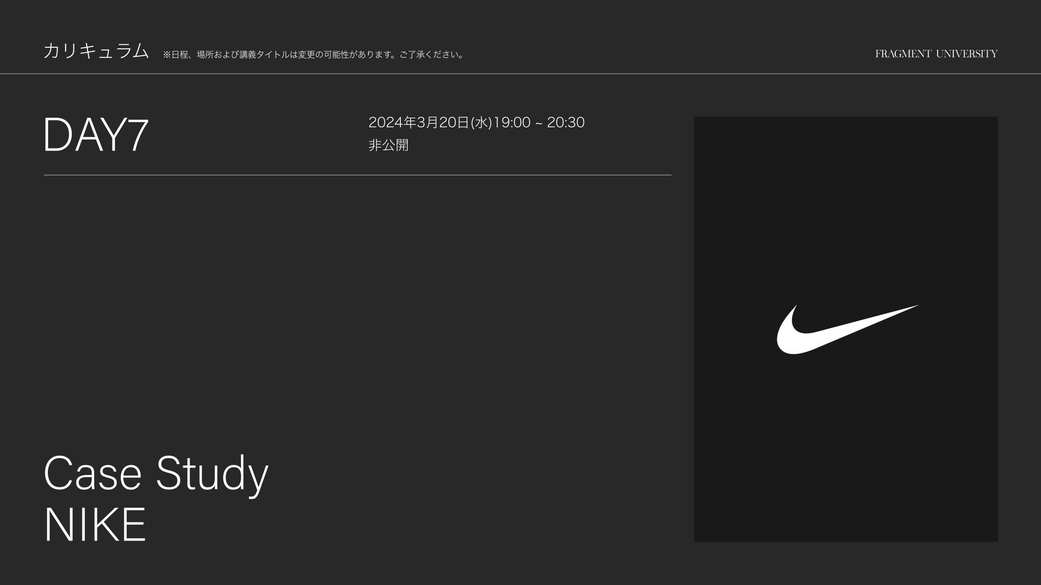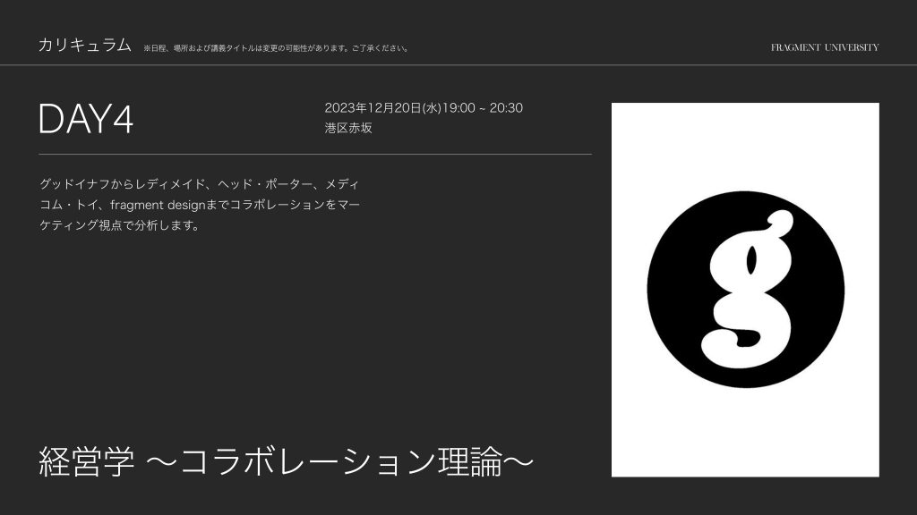 日本のストリートカルチャー黎明期から現代のラグジュアリーブランドとの協業に至るまで、藤原ヒロシはさまざまなブームやヒットプロダクトを生み出し続けてきた。その背景にあるのは、いわゆる一般的なマーケティング論とは一線を画する嗅覚やセンス。本人も「まったく意識していなかった」という、それらを“非言語マーケティング”と題し、インプット術・発想術・コラボ術などを体系化したカリキュラムとして組み立てた。講座の対象となるのは、藤原ヒロシの生き方・働き方・遊び方を学びたい全てのマーケッター、プロデューサー、クリエイター、アパレル関係者、出版、マスコミ関係者、 およびそれらを志したい方々。 実体験を交えたマーケティングメソッドについての講義や、コラボレーション実績のある企業をゲストに迎えた特別な講義も実施される。