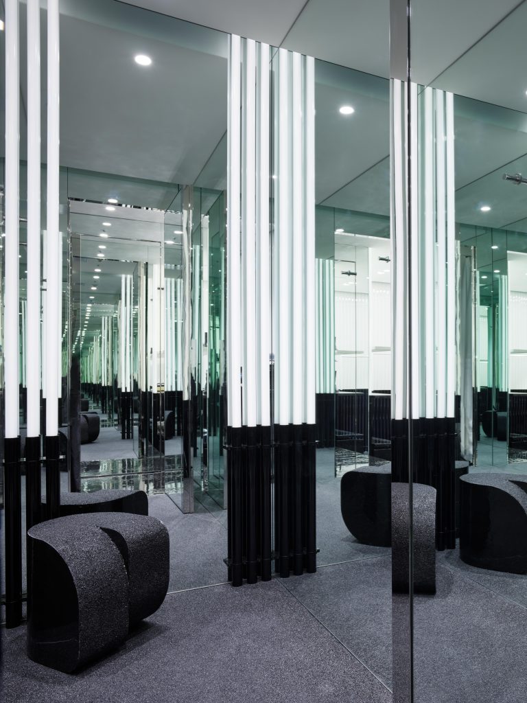 同ストアは、コンクリートに黒いペイントをほどこし、レジンで固めた床と壁面に対して、ストア全体に配置された白色のLEDチューブと透明のチューブが混じった大胆なコントラストを描く。ブラックとホワイト、対照的な異素材の配置が織りなすコントラストは、既成概念にとらわれず、洗練されたものと日常的なものを対比させることで、曖昧な中に生み出される美学を表現するブランドの コンセプトを反映している。