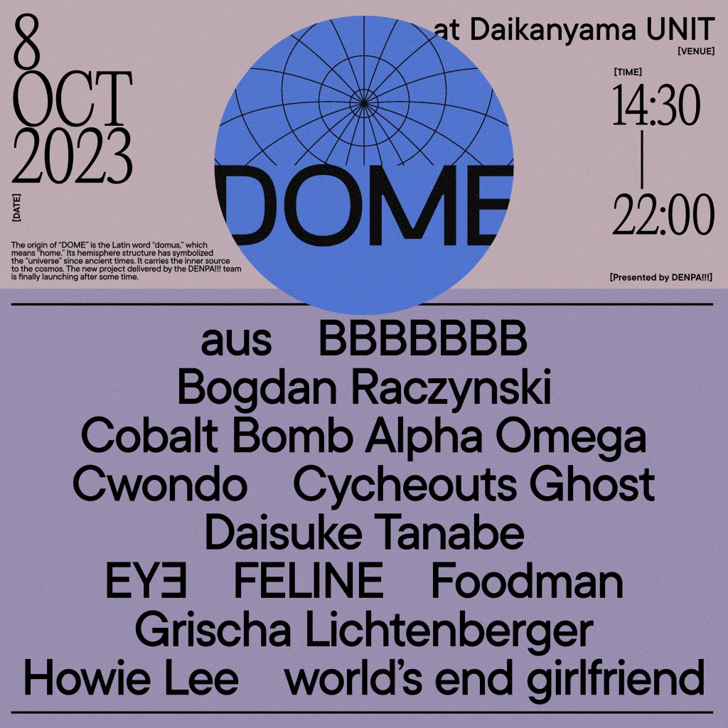 「DOME」のコンセプトについては、「DOMEの語源はラテン語のdomusであり『家』という意味を持ちます。 またその半球体の構造は古来より『宇宙』のシンボルとされてきました。 自らの内側にある源流を宇宙に渡す。 これまでにさまざまなカルチャーを横断してきたDENPA!!!/電刃チームが元来夢見ていた、まさしく“童夢”を実現すべく立ち上げた新企画となります」とコメントする。